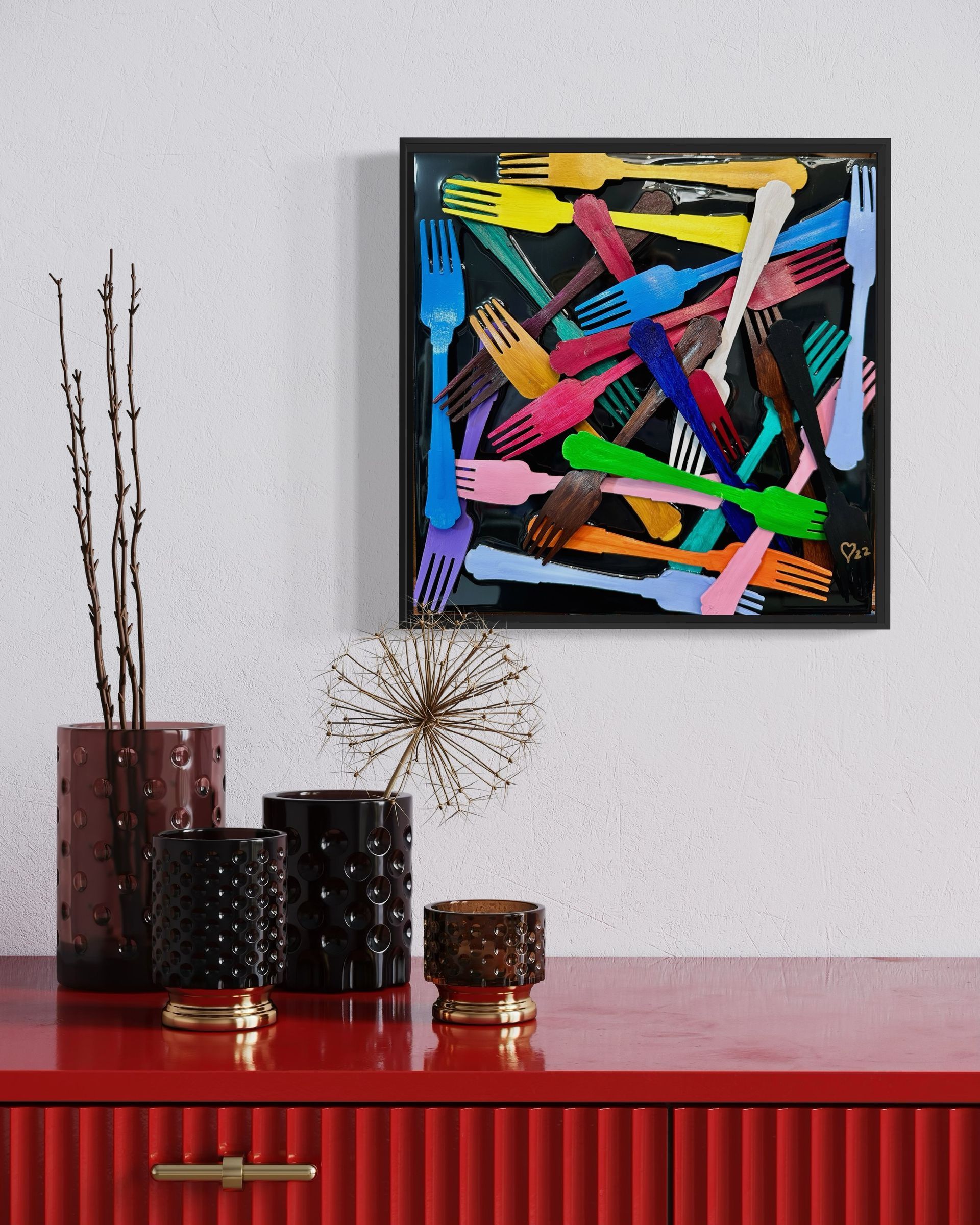 Acrylic, glass and resin on a 24"X18" cradled birch wood panel framed in a black lacquer floating frame. $1,232 Cdn.