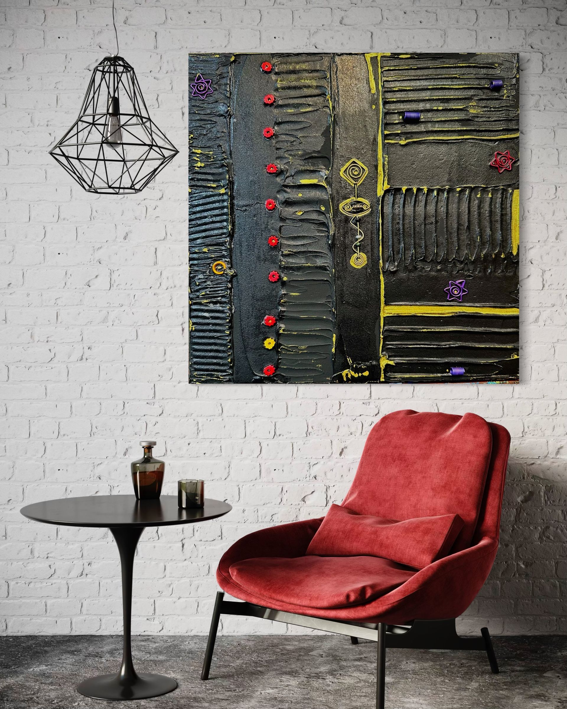 Acrylic, metal & wood on canvas. Inquire for price.