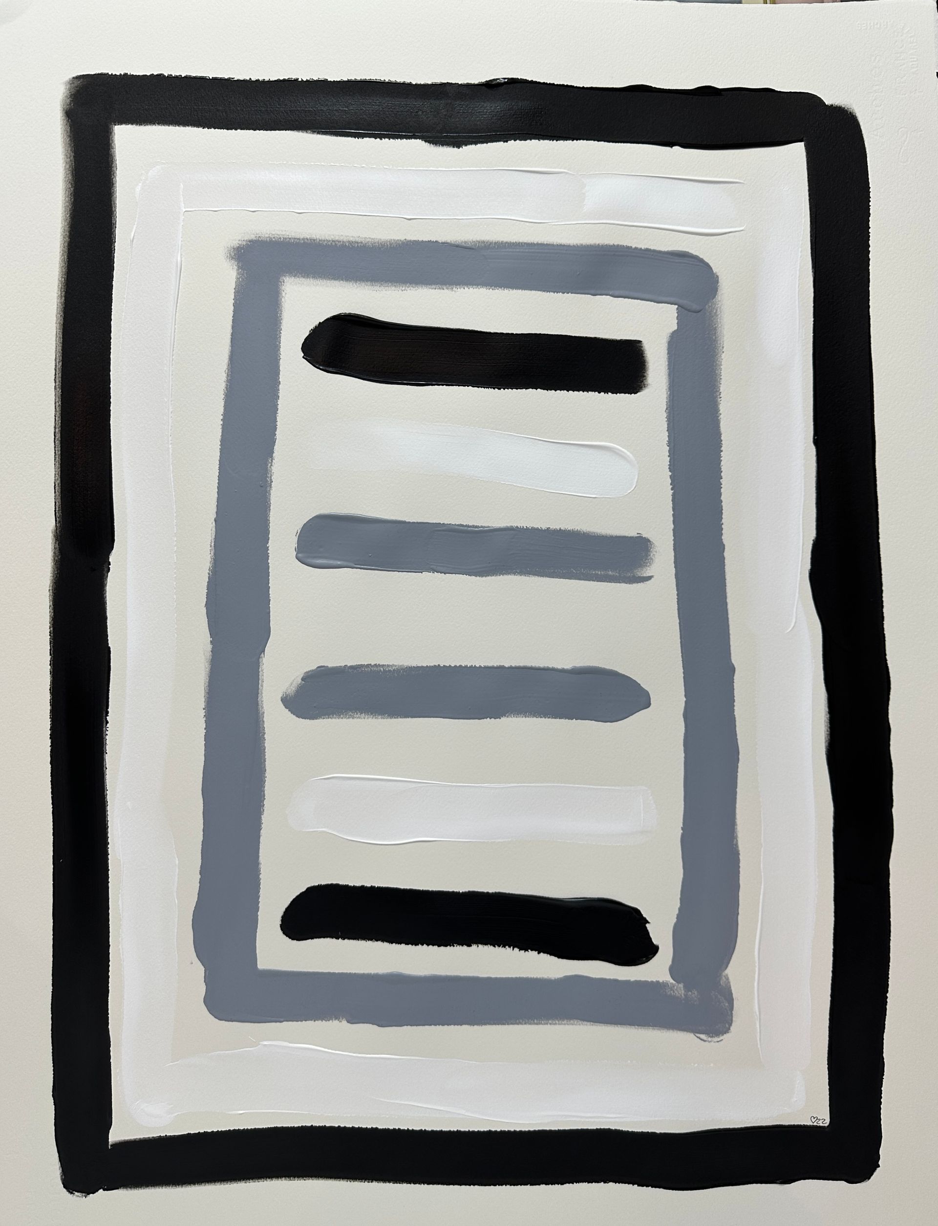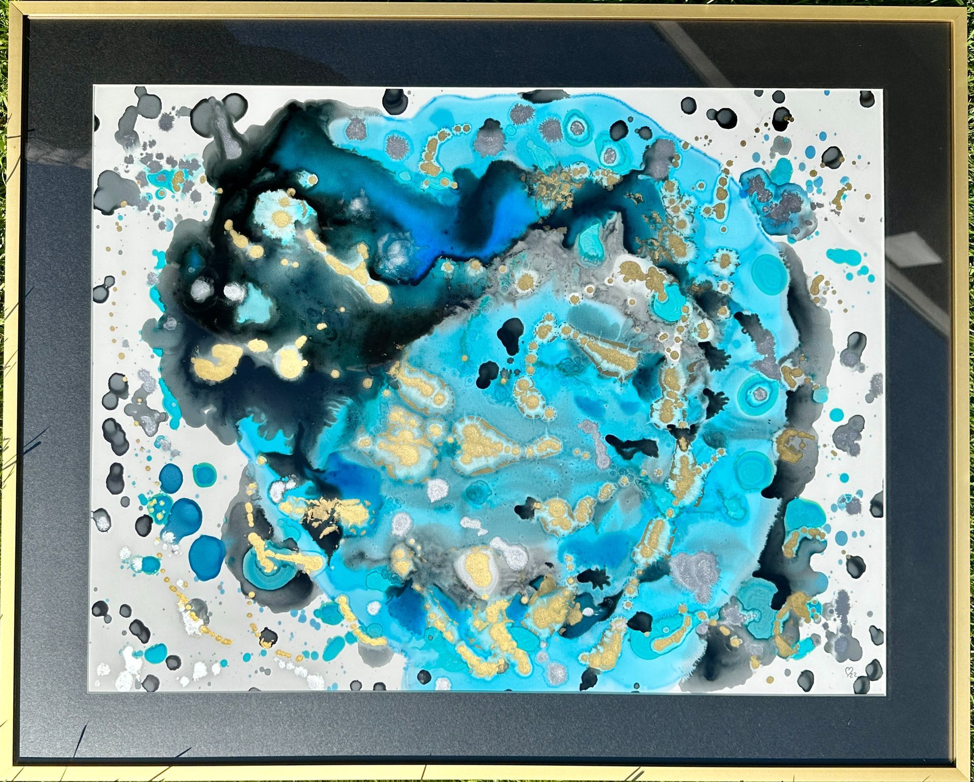Acrylic on thick watercolour paper in a wide black shiny 35.5" X 31.5" with a gold mat. $1,750 Cdn.