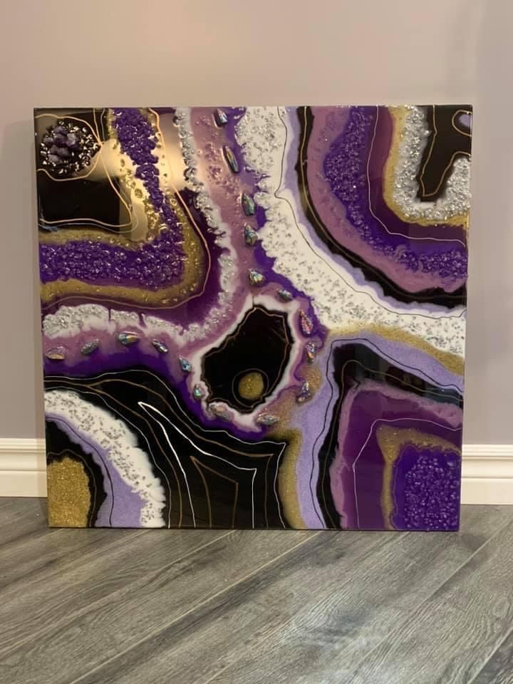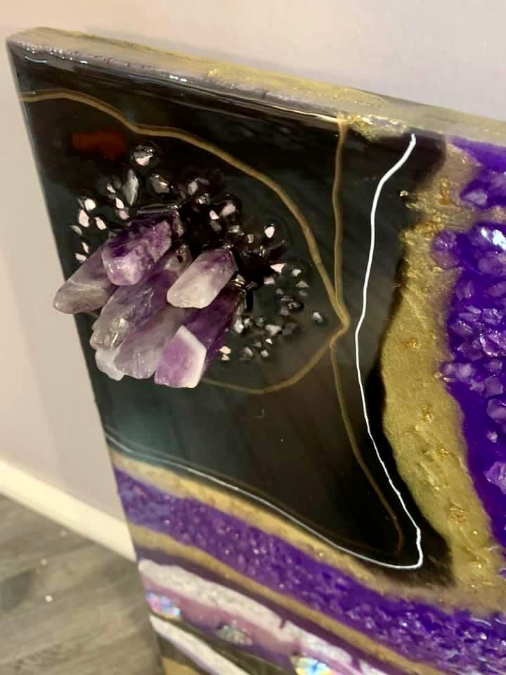 Resin, glass, amethysts, crystals, acrylic paint pen, acrylic paint. NFS