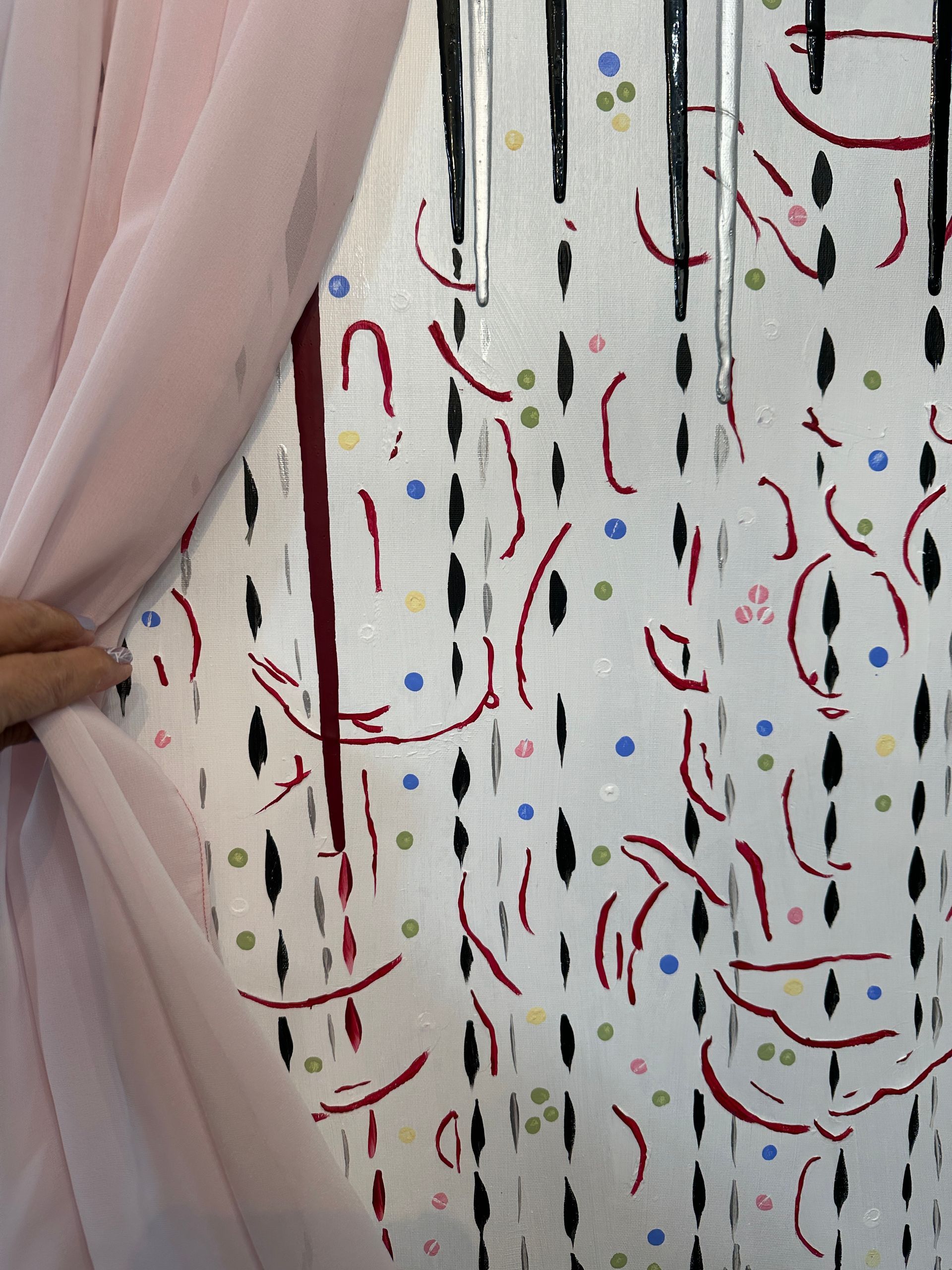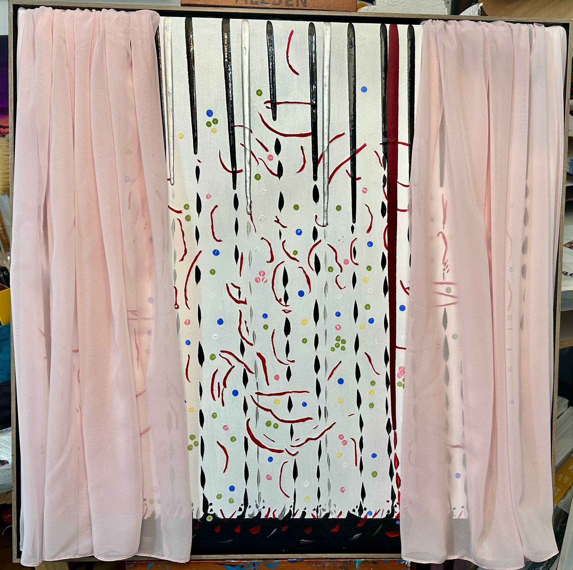 28"X28" acrylic on canvas with veil that can be tied back. #9 in my "Life Happens" series".