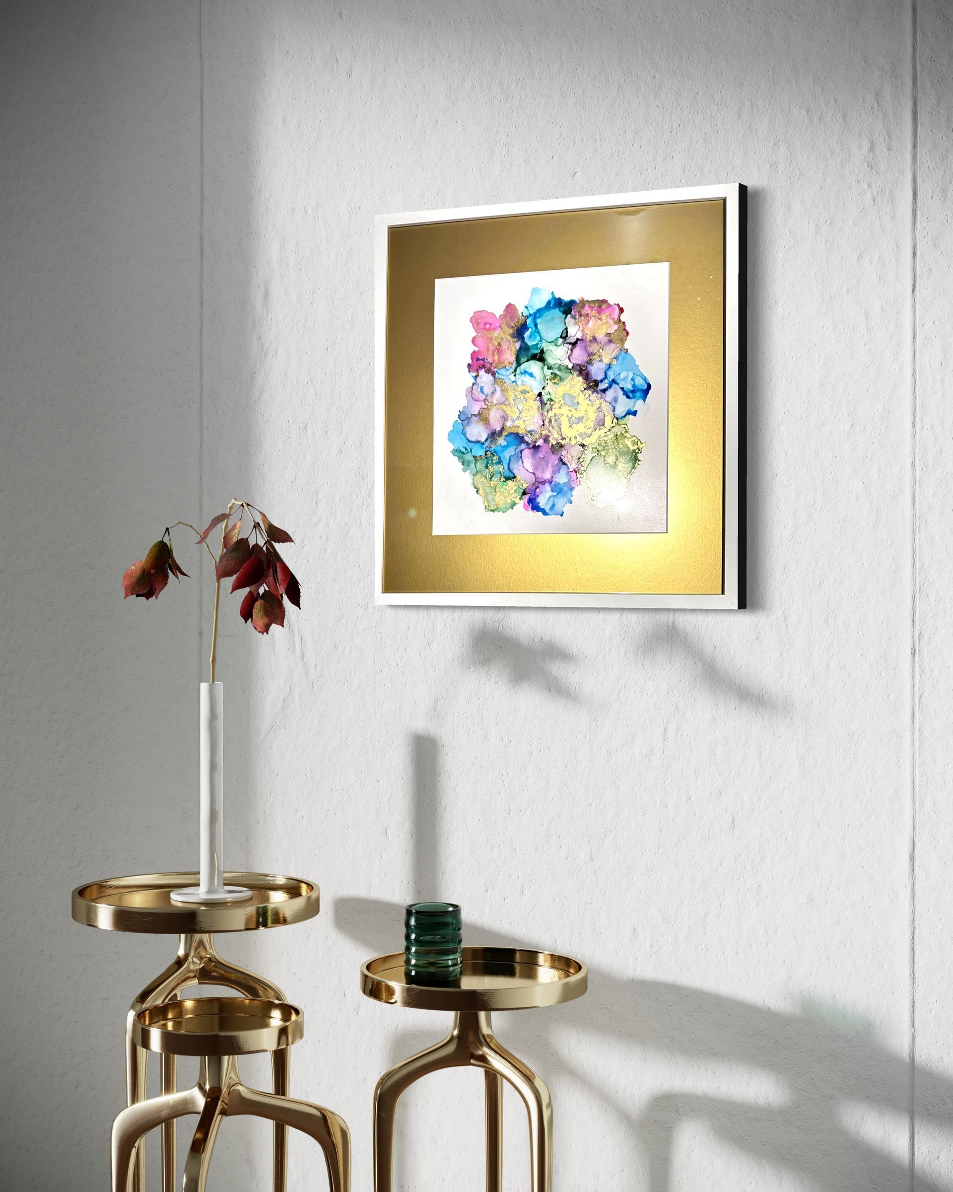 Acrylic, glass and gold leaf on a 20.25" X 26.25" cradled birch wood pallet covered in 3 coats of acrylic resin. Professionally framed in a gold floating frame measuring 20.25" X 26.25". 1,795 Cdn.