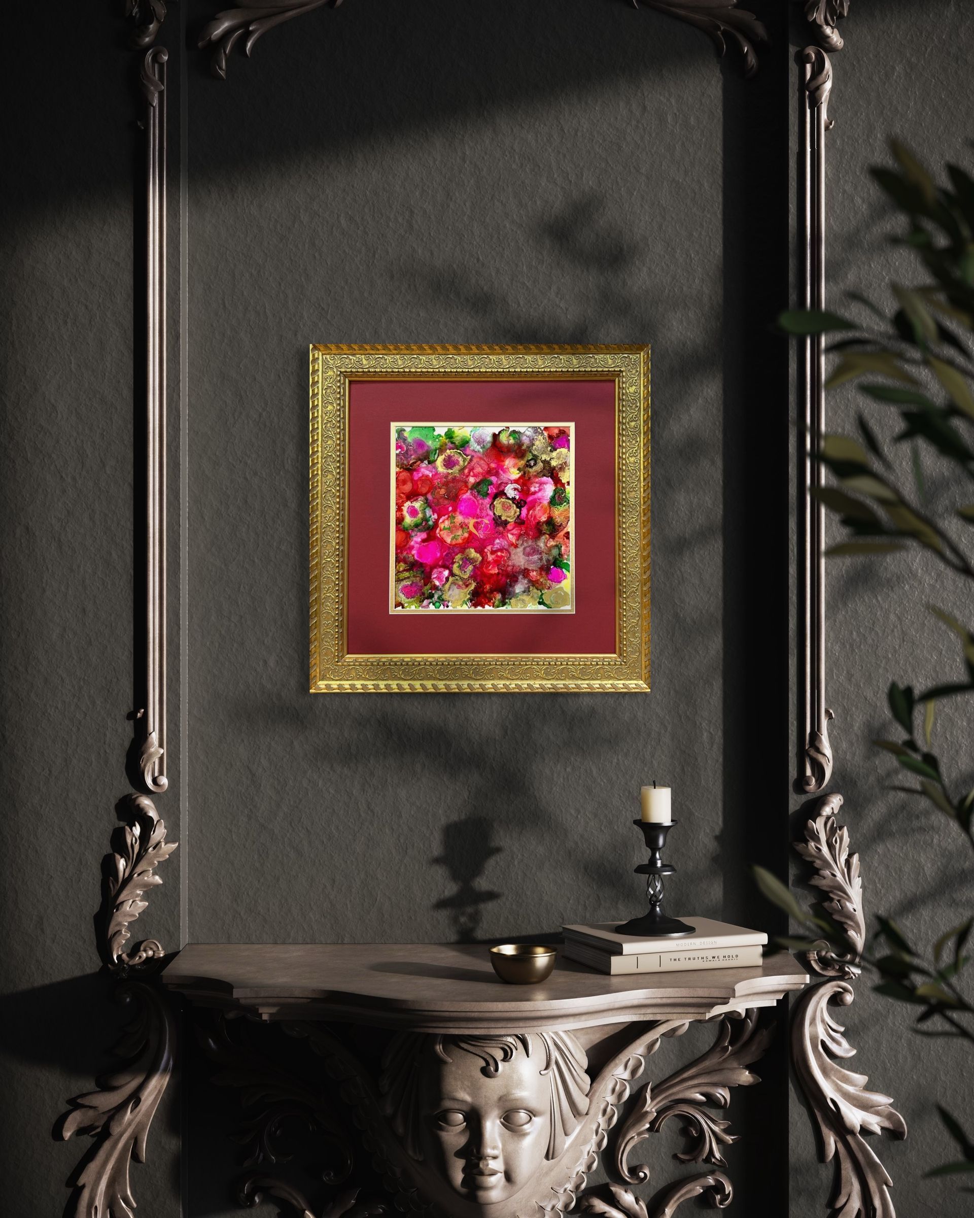 Alcohol ink on Yupo in a burgundy matted very solid wooden high quality gold frame measuring 21" X 21.5". $1,600 Cdn.