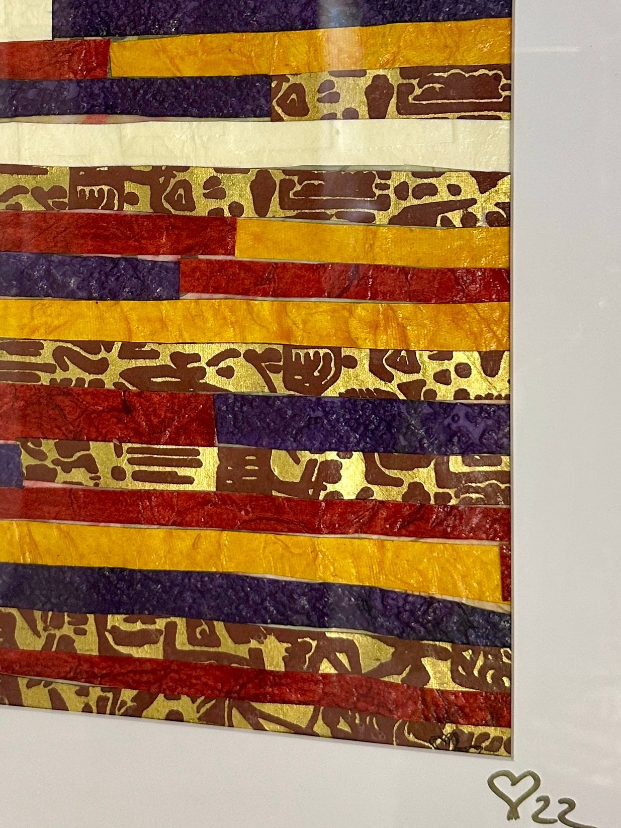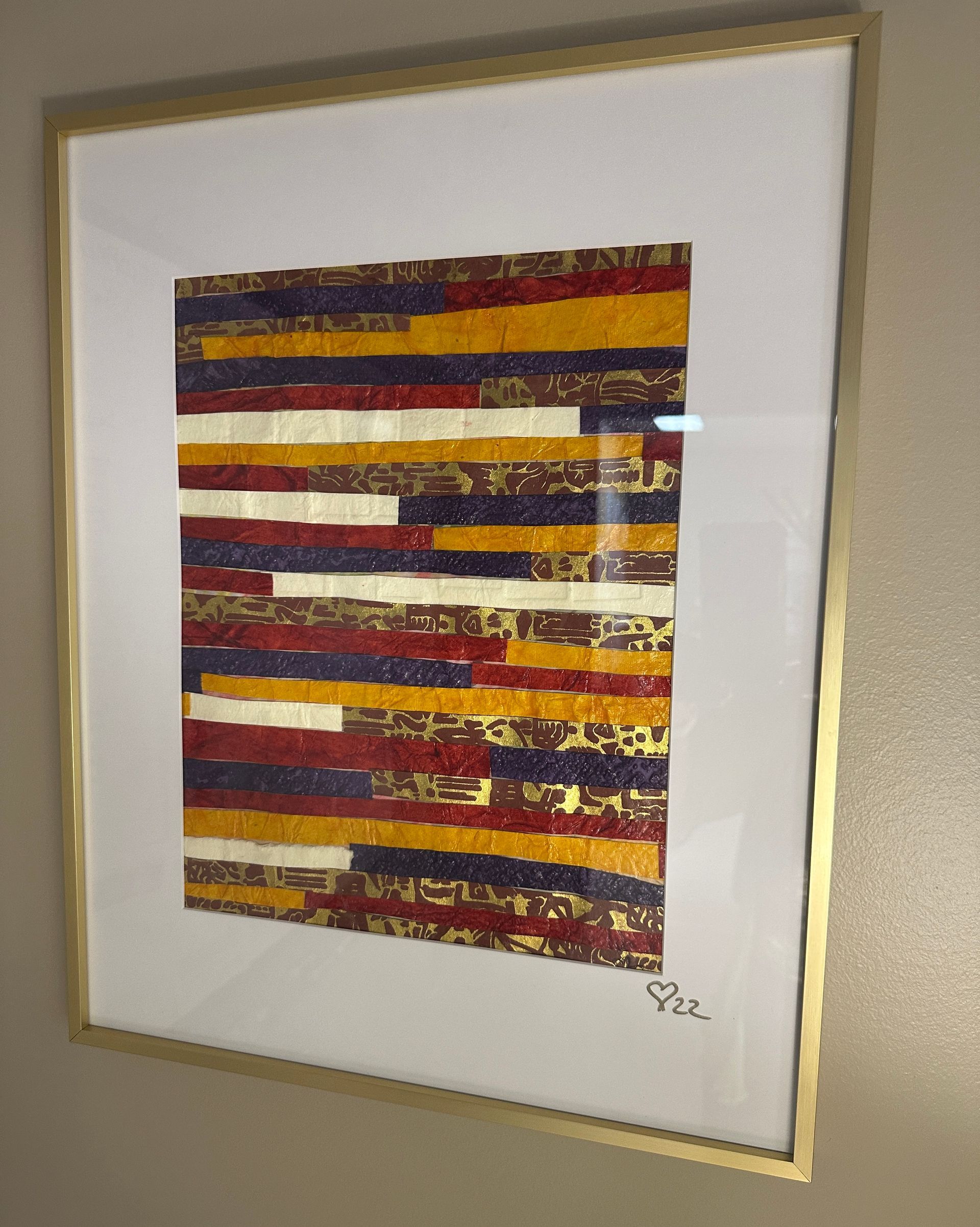 Collage with thick decorative paper. 16.5" X 20" framed in gold frame with white matte. $166 Cdn.